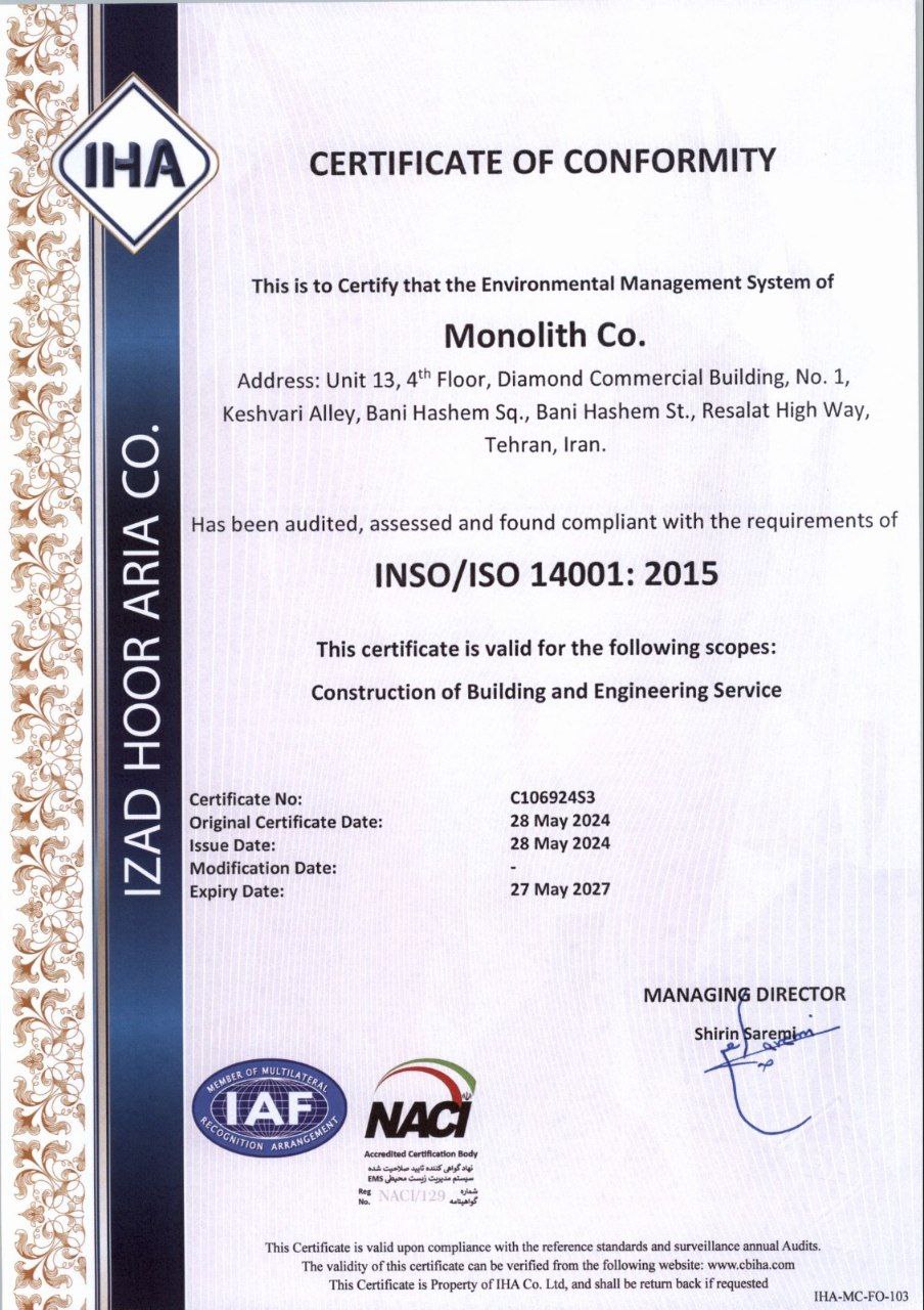 هدف اصلی شرکت مونولیت از دریافت گواهینامه فوق ، بازنگری سیستم های مرتبط با کاهش ضایعات ، مدیریت پسماند ، بهبود عملکرد زیست محیطی، افزایش عملکرد نظارتی بر فرآیندهای کاری و در نتیجه عمل به تعهد خود در قبال مسئولیت اجتماعی برای رعایت قوانین زیست محیطی و الزامات قانونی می باشد.