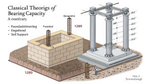 که در آن $ N_c $، $ N_q $ و $ N_\gamma $ عوامل ظرفیت باربری هستند که تابعی از $ \phi $ هستند. پس از ترزاقی، محققان دیگری نظیر میرهوف (Meyerhof, 1951, 1963)، هانسن (Hansen, 1970) و وسیک (Vesic, 1973) اصلاحاتی را برای در نظر گرفتن عواملی چون شکل پی، شیب بار، شیب زمین و عمق مدفون شدن پی ارائه دادند که منجر به فرمولهای جامعتری شد. این تئوریها، با وجود سادگی، هنوز هم مبنای بسیاری از طراحیهای اولیه هستند.