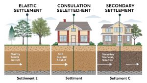 علاوه بر ظرفیت باربری، کنترل نشست پیها از اهمیت حیاتی برخوردار است. کنترل نشست پیها از اهمیت حیاتی برخوردار است. چرا که نشست بیش از حد یا نامتقارن میتواند منجر به آسیبهای سازهای، مشکلات عملکردی و حتی از کارافتادگی سازه شود. نشست کلی پی معمولاً شامل سه جزء اصلی است: نشست الاستیک (نشست آنی)، نشست تحکیمی و نشست ثانویه.